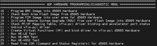 | 18 - Program FIM Image into user1 area for Intel® FPGA PAC D5005 Hardware | This option programs the FIM image "D5005_page1_unsigned.bin" into user1 area in flash |