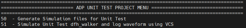 | 51 - Simulate Unit Test dfh_walker and log waveform | This option runs the dfh_walker based on the environment variable "UNIT_TEST_NAME=dfh_walker" in the evaluation script. A user can change the test being run by modifying this variable |