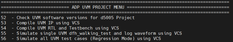 | 54 - Compile UVM RTL and Testbench | This option compiles the UVM RTL and Testbench |