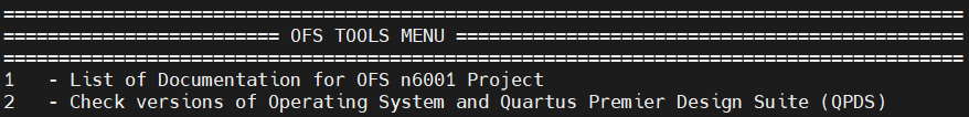 In the example above two tests are run in order ie 0, and 1 and the following menu options are executed ie 2- List of Documentation for OFS n6001 Project and 9 - Check OFS software versions for OFS n6001 Project