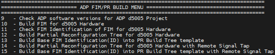 | 15 - Build Base FIM Identification(ID) into PR Build Tree template with Remote Signal Tap | This option copies the contents of the fme-ifc-id.txt into the Partial Reconfiguration Tree for Remote Signal Tap to allow the FIM amd Partial Reconfiguration Tree to match and hence allow subsequent insertion of AFU and OneAPI workloads |