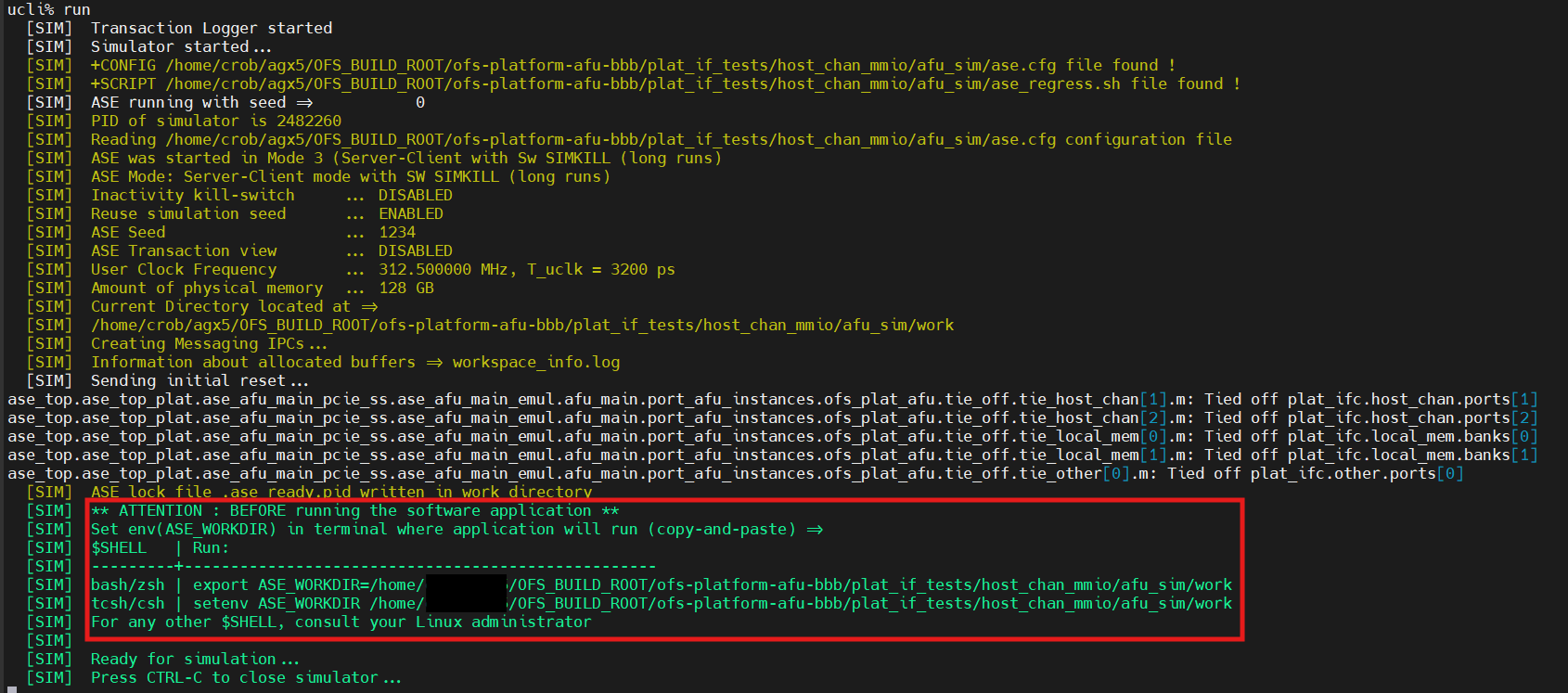 The previous commands will build and run the Synopsys® VCS® RTL simulator, which prints a message saying it is ready for simulation. The simulation process also prints a message instructing you to set the ASE_WORKDIR environment variable in a second shell.