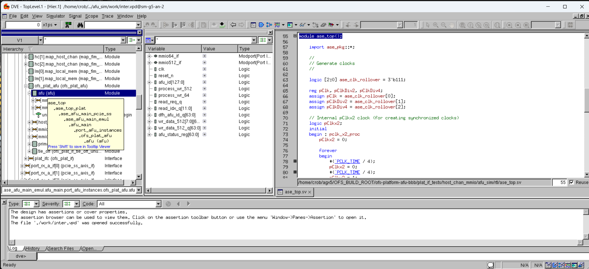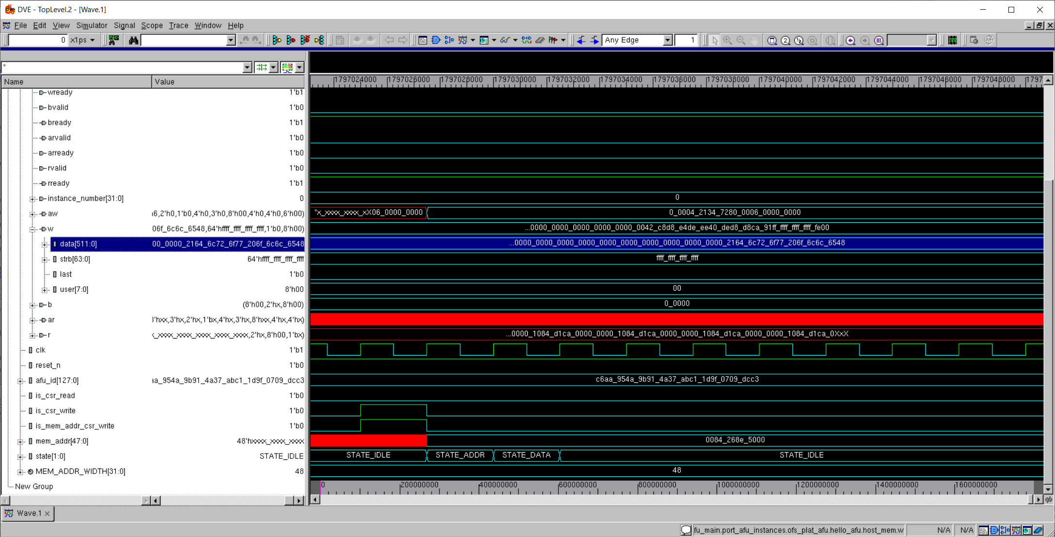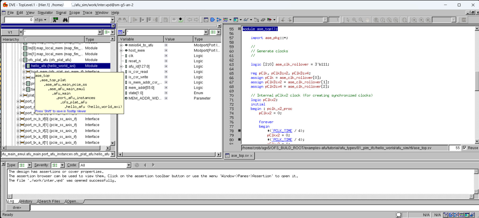 This brings up the DVE GUI and loads the simulation waveform files. Use the Hierarchy window to navigate to the afu instance located under, ase_top | ase_top_plat | ase_afu_main_pcie_ss | ase_afu_main_emul | afu_main | port_afu_instances | ofs_plat_afu | hello_afu
