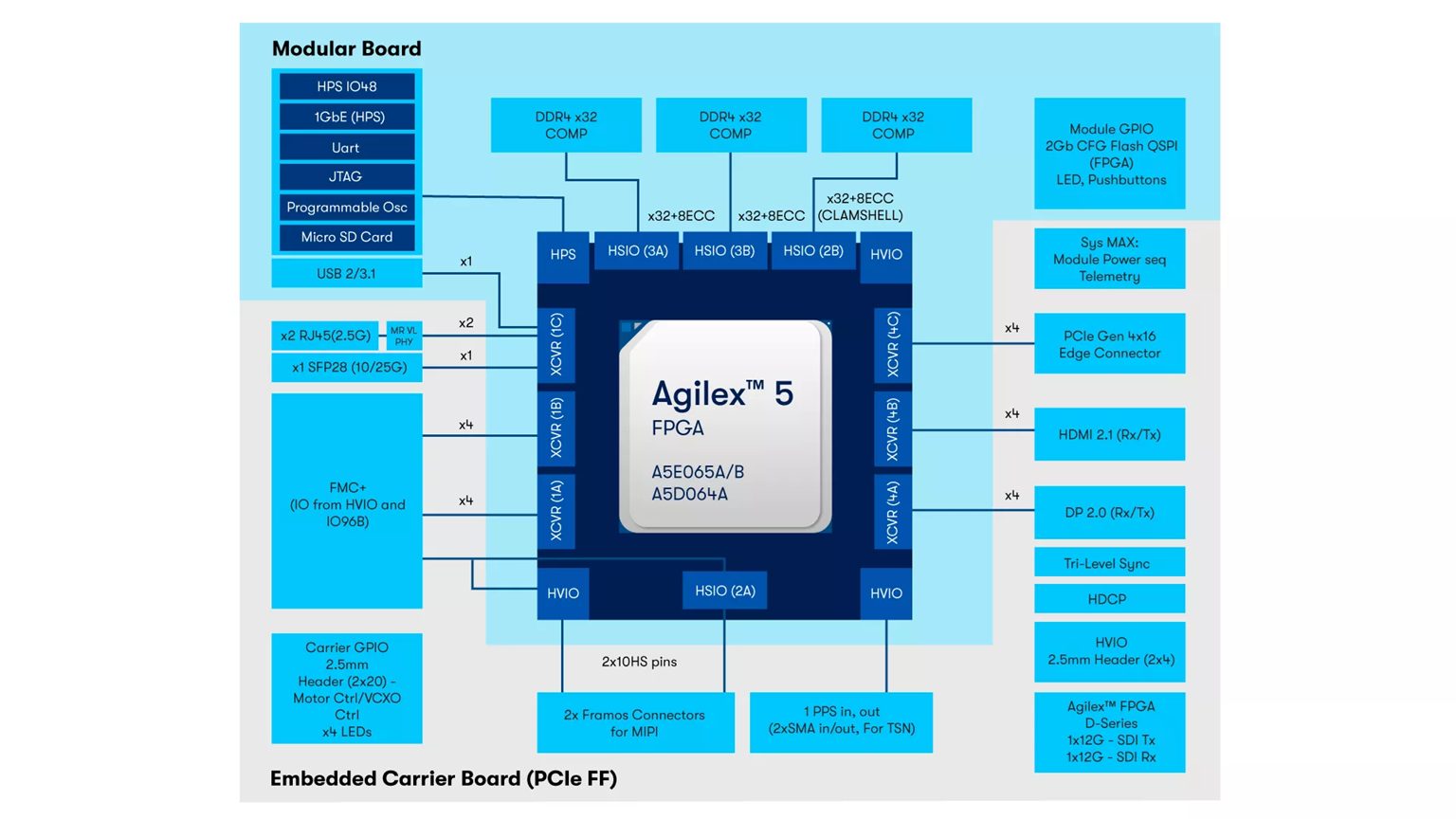 The block diagram of the Agilex 5 Modular DK is shown below: