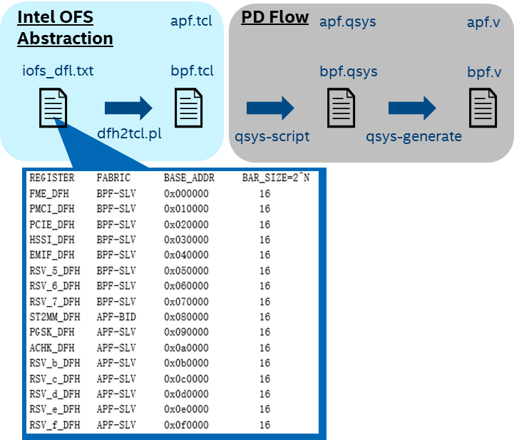 DFL | Device Feature List, A concept inherited from OFS. The DFL drivers provide support for FPGA devices that are designed to support the Device Feature List. The DFL, which is implemented in RTL, consists of a self-describing data structure in PCI BAR space that allows the DFL driver to automatically load the drivers required for a given FPGA configuration. |