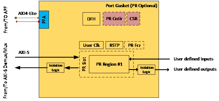 The Port Gasket contains all the PR specific modules and logic, such as PR slot reset/freeze control, user clock, remote STP etc. For this reference example only one PR slot is supported. The following figure depicts the high level view of the Port Gasket: