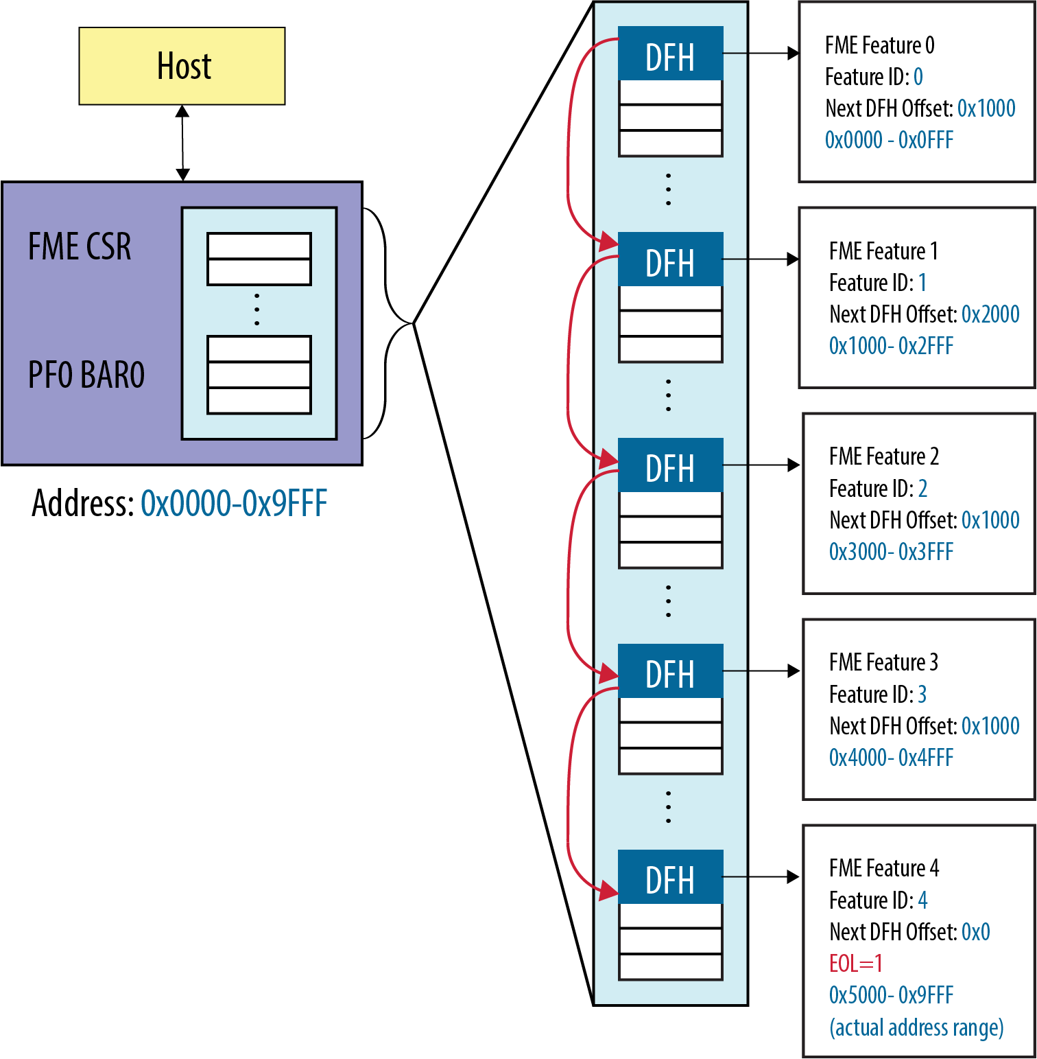 Any feature, such as a memory interface or global error control that you want to control through FME, must expose its capability to host software drivers. New features are exposed to the FME by adding a device feature header (DFH) register at the beginning of the feature's control status register (CSR) space. The FME CSR maps to physical function 0 (PF0) Base address register 0 (BAR0) so that software can access it through a single PCIe link. For more information about DFHs, refer to the FPGA Device Feature List Framework Overview