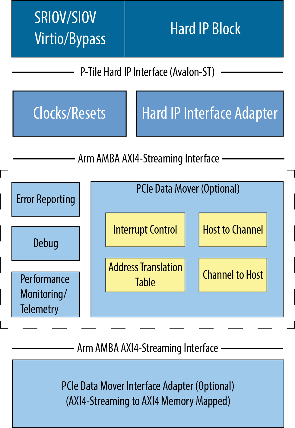 - Basic building blocks for interconnect and PF/VF translation and arbitration; Platform Interface Manager (PIM) which provides Avalon® and Arm® AMBA® 4 AXI4 bus compliant interfaces.
