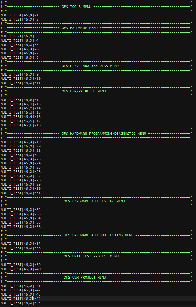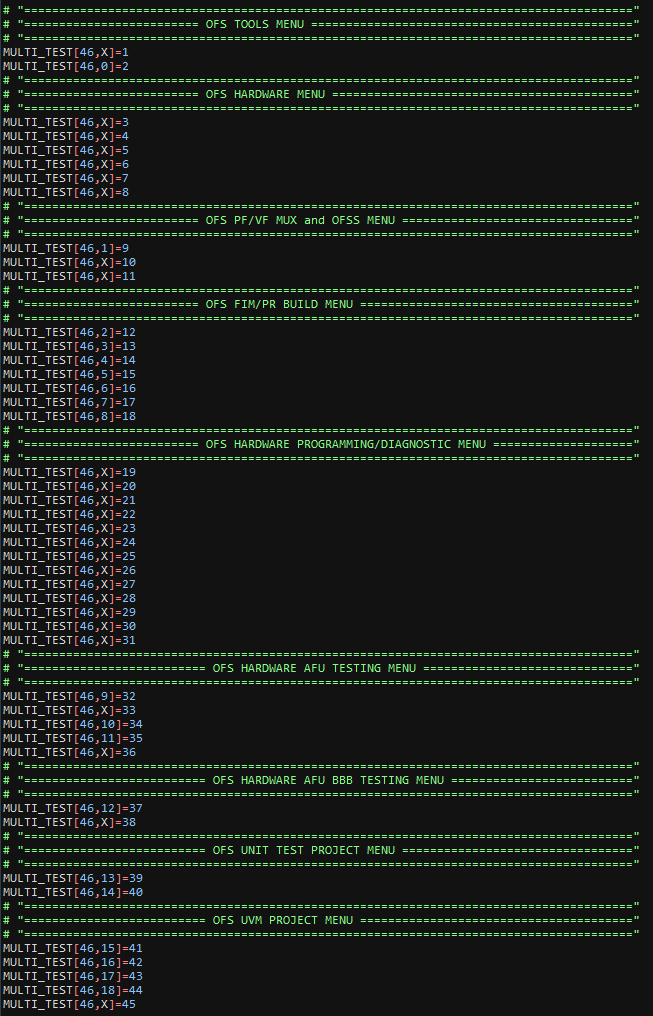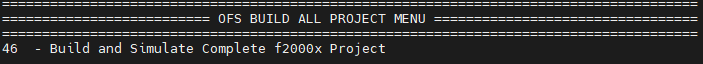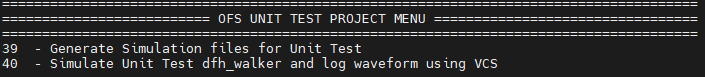 A user can run a sequence of tests and execute them sequentially. In the example below when the user selects option 46 from the main menu the script will execute 24 tests ie (main menu options 2, 9, 12, 13, 14, 15, 16, 17, 18, 32, 34, 35, 37, 39, 40, 41, 42, 43 and 44. These 19 menu options are chosen to build the complete OFS flow covering build, compile and simulation.