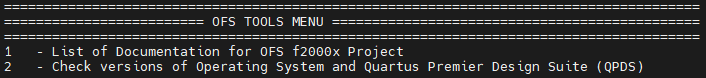 In the example above two tests are run in order ie 0, and 1 and the following menu options are executed ie 2- List of Documentation for OFS f2000x Project and 9 - Check OFS software versions for OFS f2000x Project